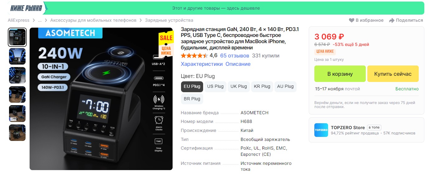 Это 10 в 1: можно одновременно заряжать кучу гаджетов, причём с быстрой зарядкой до 140 Вт. Ещё тут есть беспроводная зарядка и большой информативный дисплей. А для всего этого предусмотрено 4 порта Type-C, 2 USB и даже часы с будильником.