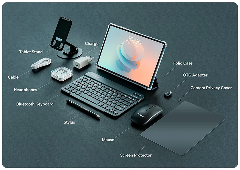 При этом за такую цену тут еще и "всё в одном": кроме адаптера для зарядки с кабелем в комплект также входят чехол-подставка, беспроводные клавиатура и мышь, стилус, простенькие беспроводные наушники, металлическая подставки и OTG-адаптер.