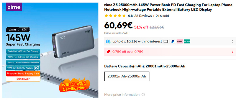 Аккумулятор Zime Z5 для зарядки ноутбуков и любых других устройств известного производителя. Емкость - 25000 мАч, мощность зарядки - аж 145 Вт (можно заряжать ноутбук и одновременно, например, смартфон), поддержка протоколов QC3.0 и PD3.0. Сам аккумулятор заряжается на мощности 100 Вт. Есть дисплей показывающий уровень заряда аккумулятора и параметры зарядки, порты USB-A (65 Вт) и два порта Type-C (100 и 140 Вт).