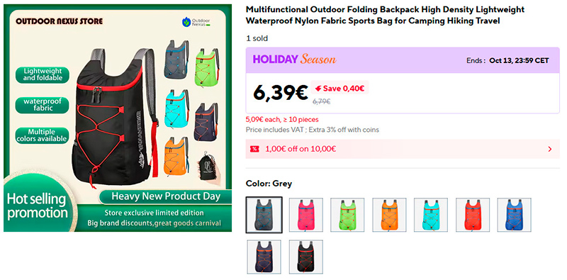 Очень легкий складной рюкзачок, который в сложенном виде умещается в чехол размером с ладонь (в видео это показывают). Девять видов расцветок.