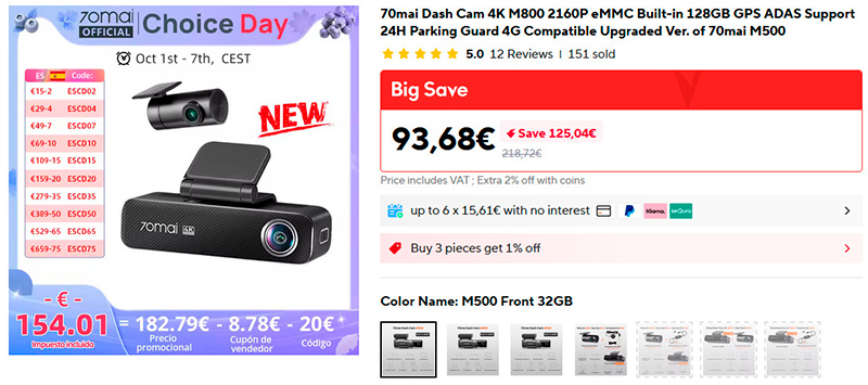 Качественный, продвинутый и очень компактный видеорегистратор 70mai 4K M800. У передней камеры разрешение 4К, есть 128 ГБ встроенной памяти, есть GPS, ADAS и режим парковки 24 часа. У задней камеры разрешение FullHD. Видеорегистратор настраивается через приложение.