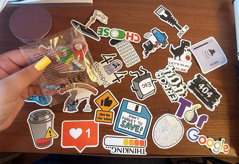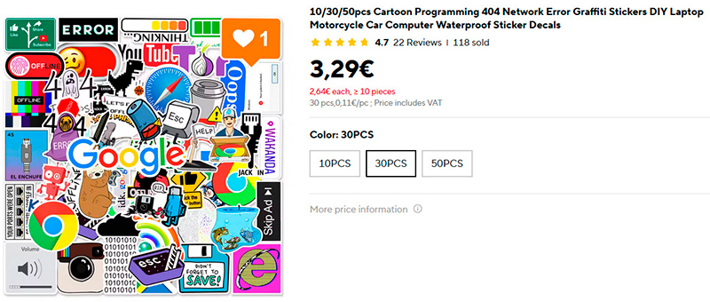 Комплект из 10, 30 или 50 забавных наклеек для ноутбука, компьютера, холодильника - да хоть для настольной лампы! Тематика - в основном, компьютерная. Стоят две копейки, а удовольствия - на 50 евро, я проверял.