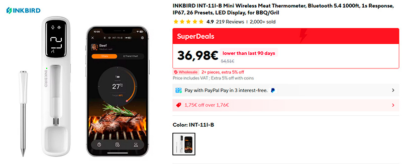 Конечно, беспроводной термометр для мяса сильно удобнее, чем проводной, но у меня был какой-то беспроводной термометр, и он все время глючил - пропадала связь термометра с приложением. Однако знакомый пользуется вот таким беспроводным термометром INKBIRD INT-11I-B, и он говорит, что после сопряжения никаких проблем со связью не было. Работает с приложением, в приложении все очень удобно. Да и продаж там - более двух тысяч со средней оценкой 4,9. Заказал себе.