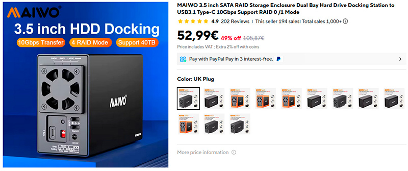Продвинутая док-станция MAIWO для двух жестких дисков. Емкость - до 40 ТБ, USB 3.2 со скоростью передачи до 10 Гбит, поддерживает RAID 0/1/JBOD/Normal, хорошая система охлаждения. Более тысячи продаж, средняя оценка 4,9. Вид RAID выставляется на корпусе двумя переключателями. Задаете RAID (скорость, зеркалирование, общее пространство, раздельные диски), вставляете диски, подключаете к компьютеру и используете.