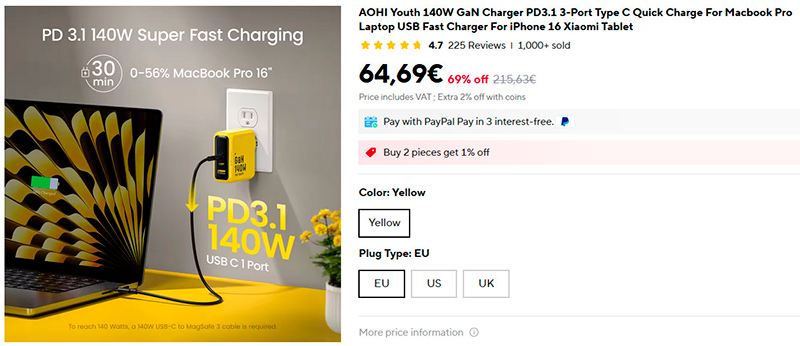Компактный и мощный GaN-адаптер AOHI Youth для питания ноутбуков и чего угодно. Поддерживает Power Delivery 3.1, максимальная мощность - 140 Вт. Три порта: два Type-C на 140 и 100 Вт соответственно, порт USB-A на 22,5 Вт. Более тысячи продаж, средний рейтинг 4,7.