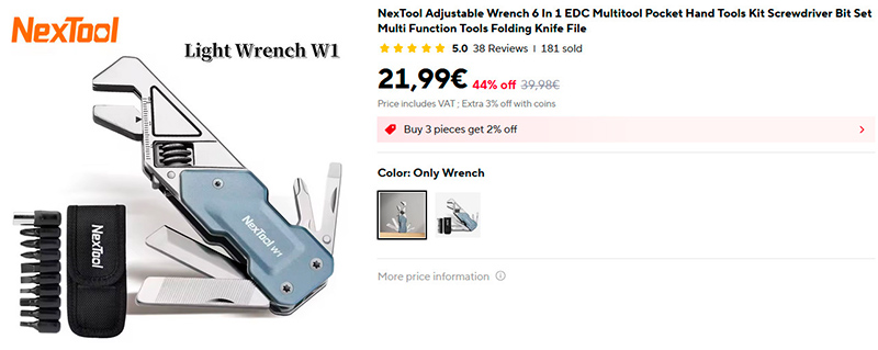 Удобный и компактный мультитул от NextTool на основе разводного ключа. В комплекте еще две отвертки - крестовая и плоская, - открывалка, нож и напильник.