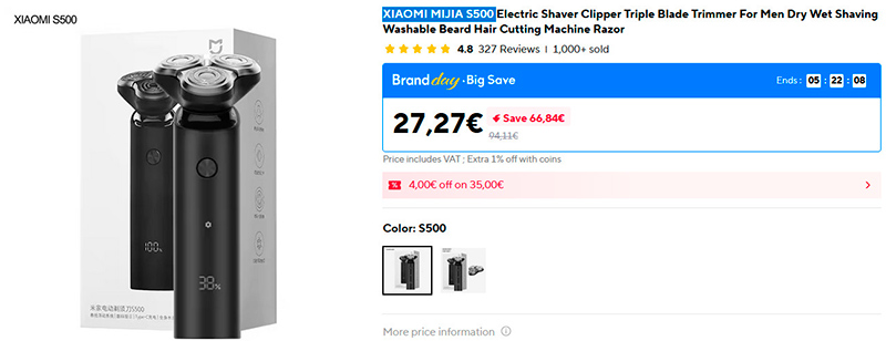Сейчас действует скидка на электробритву Xiaomi Mijia S500, и ее можно купить дешевле 30 евро, а она прям очень хороша! Я где-то с год пользовался моделью S300 - она брила хорошо, но у нее был неудачный узел зарядки, который ломался. Сейчас у меня модель S700, которая классная и долговечная, но она стоит в два раза дороже. Так вот, S500 - это несколько упрощенная по сравнению с S700 модель, которая несильно отличается (у нее меньше режимов бритья и нет подставки с зарядкой), но стоит в два раза дешевле. Заряжается она через порт USB-C. Есть вариант комплектации с дополнительной бреющей головкой (их где-то раз в полгода-год нужно менять).