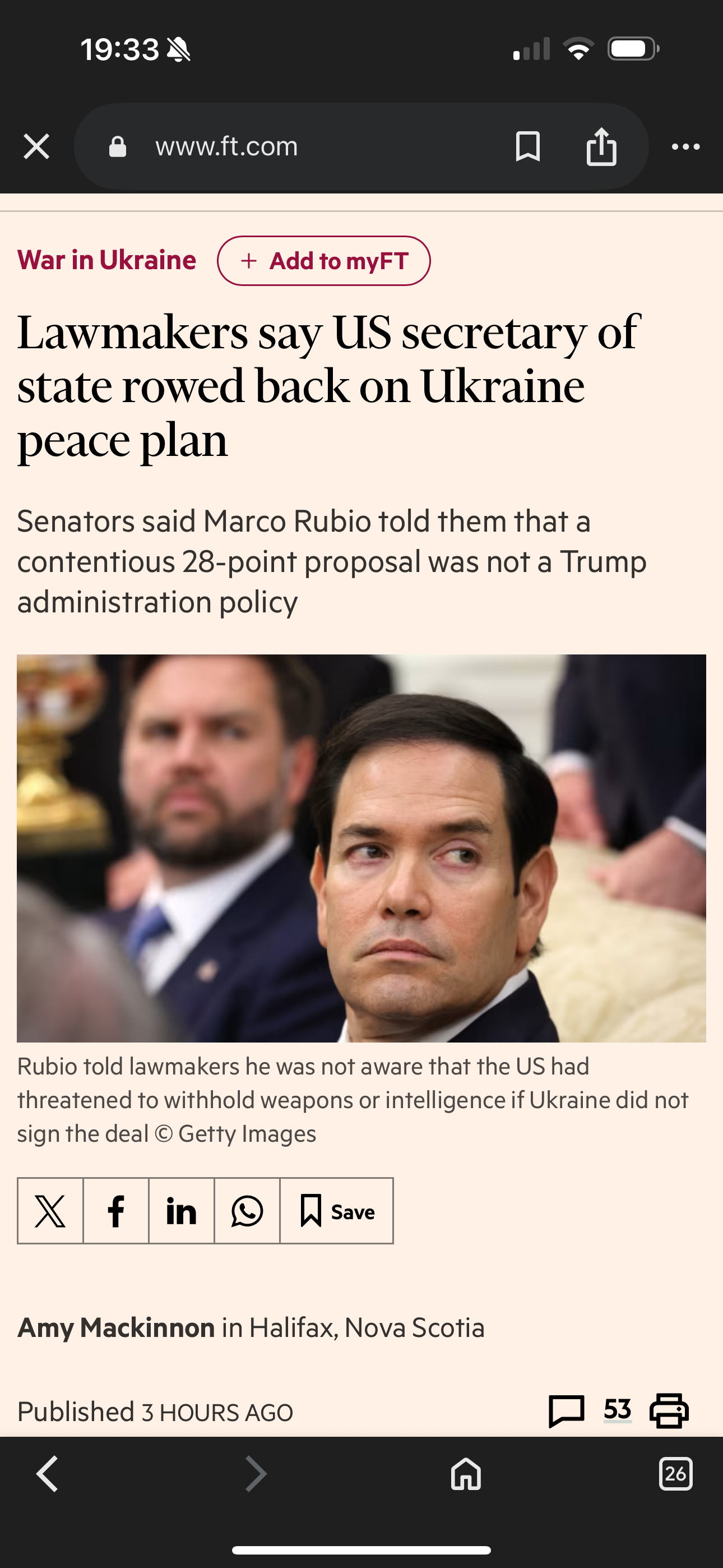 Так называемый мирный план для Украины из 28 пунктов не является планом администрации. Об этом заявили двое американских сенаторов со ссылкой на слова государственного секретаря Марко Рубио, пишет Sky News.