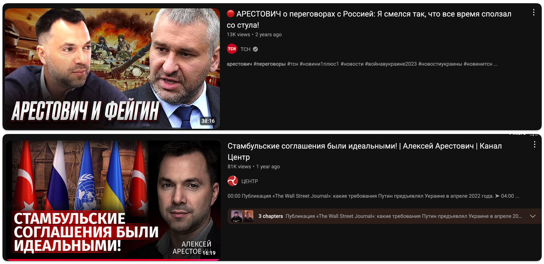 Что касается Арестовича, то он рассказывал и о том, что стамбульские соглашения были совершенно абсурдными, и о том, что они были идеальными для Украины. Прелесть в том, что почти по любому серьезному вопросу вы при некоторой настойчивости найдете две противоположные позиции Арестовича.
