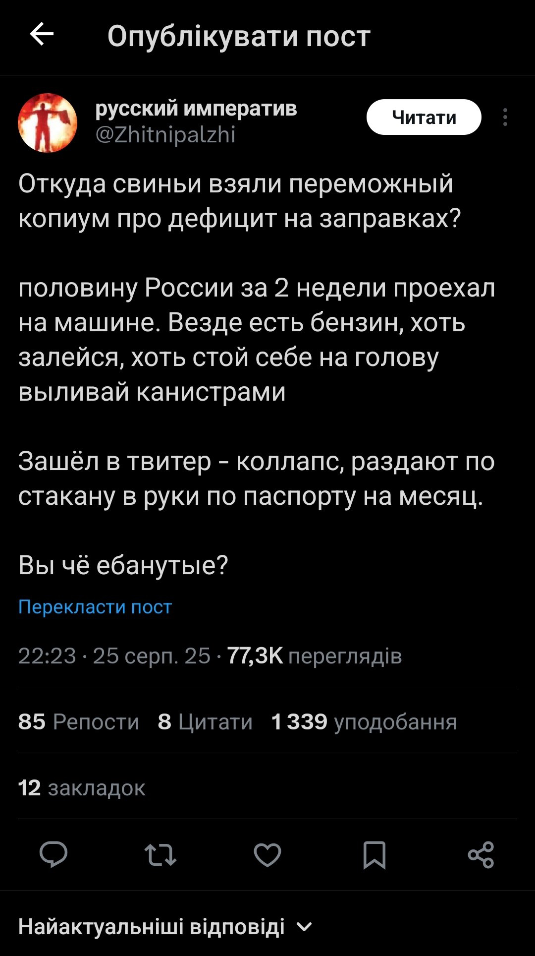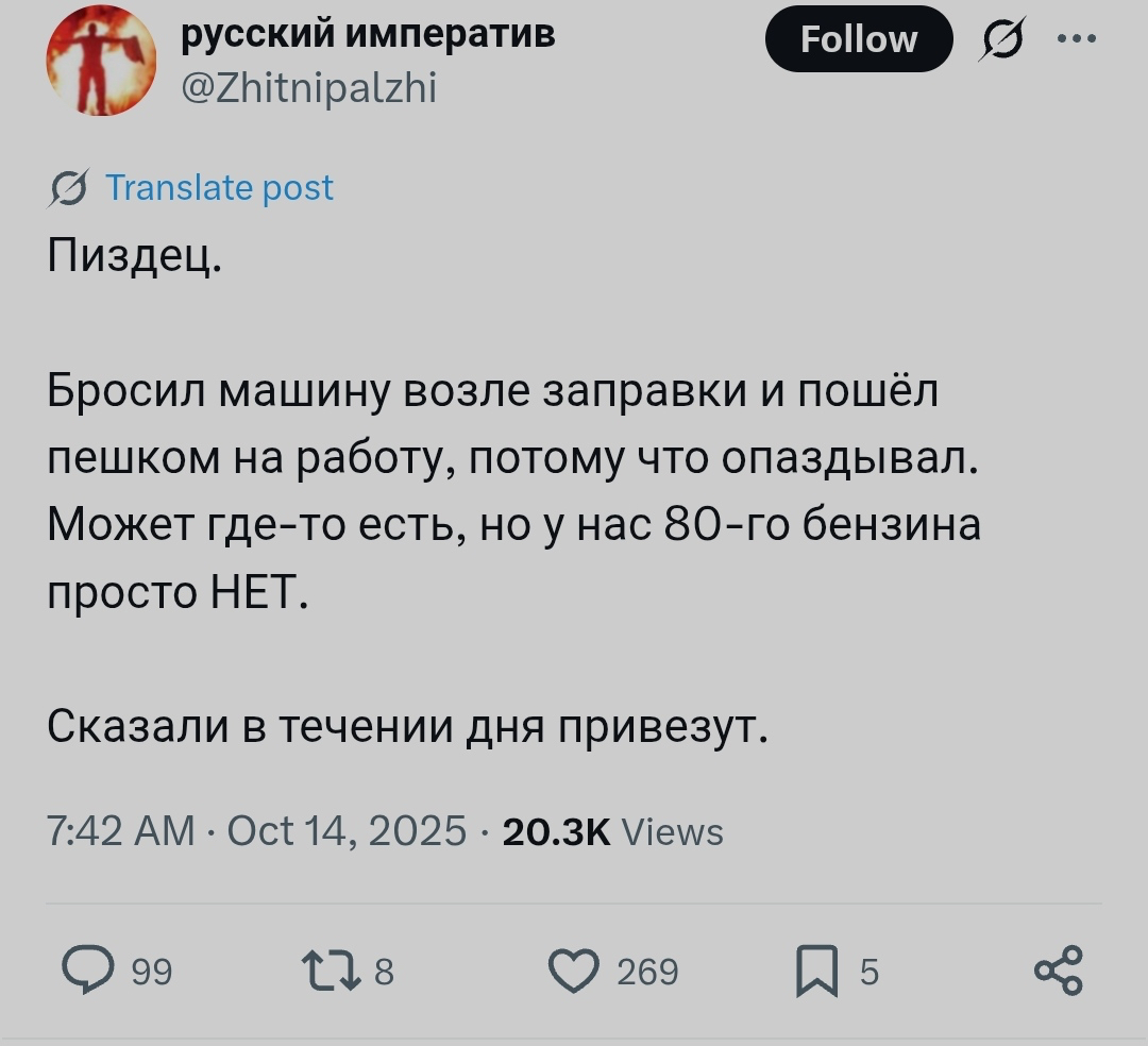 "Недостатка бензина нет. Имеется избыток. Отрицательный."