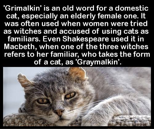 Graymalkin is the name of the grey cat familiar of the first witch in Shakespeare's «Macbeth».
