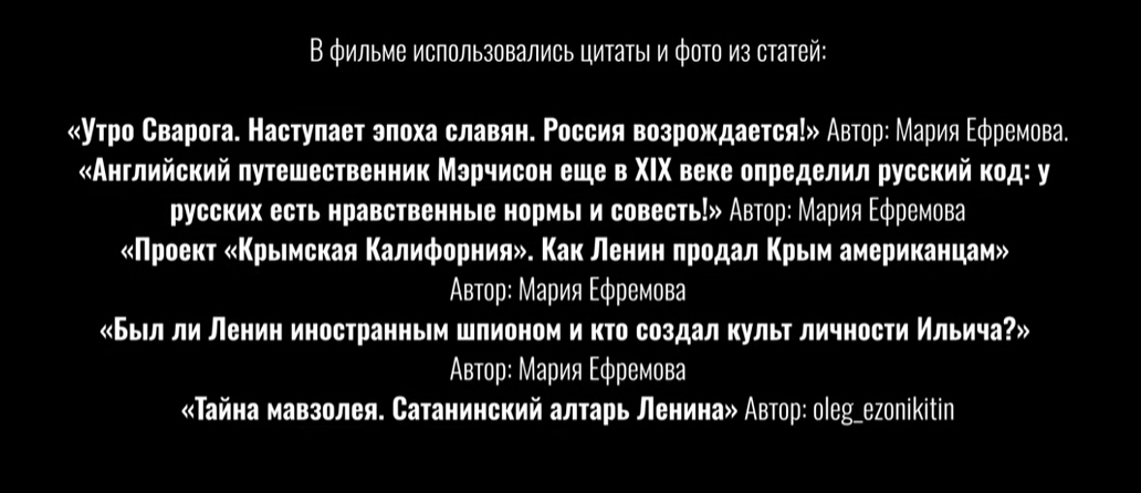 Параллельно герои читают и пересказывают брошюрные “открытия”: происхождение Ленина, банкиры, векселя, зиккураты, мистицизм мавзолея — всё это выглядит как один большой экспозиционный ролик, вставленный в семейное кино. [1] По форме — лекторий “русского кода” с тезисами про “обрусевших”, “совесть как свойство народа” и скорое “утро Сварога”, по сути — пропагандистская начинка, торчащая из каждой сцены. [1]