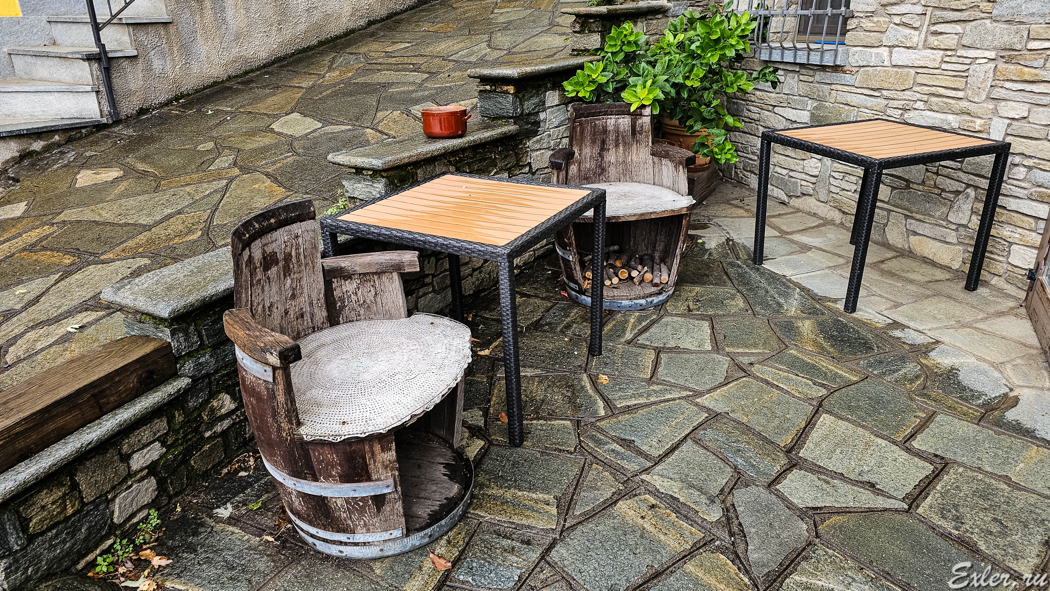 Кресла из бочек перед входом в ресторан. Кстати, вские разные кресла из бочек тут нередко встречаются: использованная бочка почти ничего не стоит, и их приспосабливают для чего-то такого.