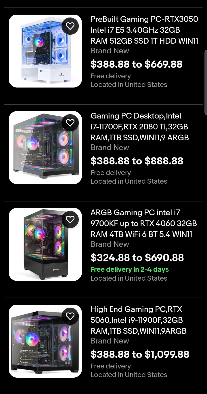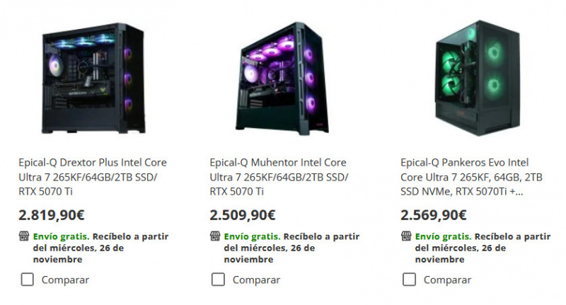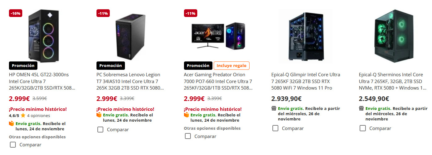 Мужик у них заказал настольный ПК в сборе на платформе Intel Core Ultra 7 256K, 32 ГБ памяти и видеокартой GeForce RTX 5080. Другие параметры он не приводит. Заплатил он за эту конфигурацию €2099 (купил со скидкой в Черную пятницу). Ну и что-то как-то, даже учитывая скидку, он больно мало заплатил, потому что подобная конфигурация там стоит порядка €2550-3000 - вон сверху скриншот всех предложений.