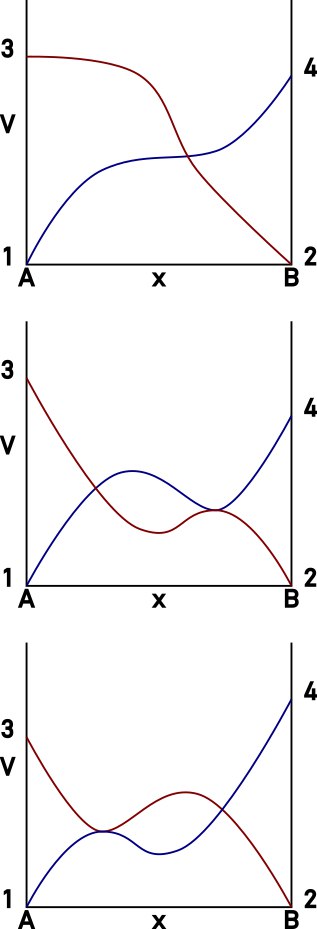 Итак, имеем одно пересечение и одно касание в произвольной последовательности (нижние рисунки). В точке касания у двух кривых одинаковы V и производные dV/dX. Ускорение одинаково, ведь оно равно dV/dt=(dV/dX):(dt/dX)=(dV/dX)(dX/dt)=V(dV/dX).