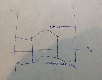 Чтобы разобраться, рисуем график зависимости скорости V (в сторону направления движения) от координаты X вдоль дороги. Вдоль оси абсцисс расстояние вдоль дороги X, вдоль оси ординат скорость V. На верхнем рисунке виден принцип: автомобиль (синяя линия) выехал из А с начальной нулевой скоростью (т. 1) и проехал Б (В) с ненулевой (т. 4). Мотоциклисту соответствует красная кривая из т. 2 в т. 3.
