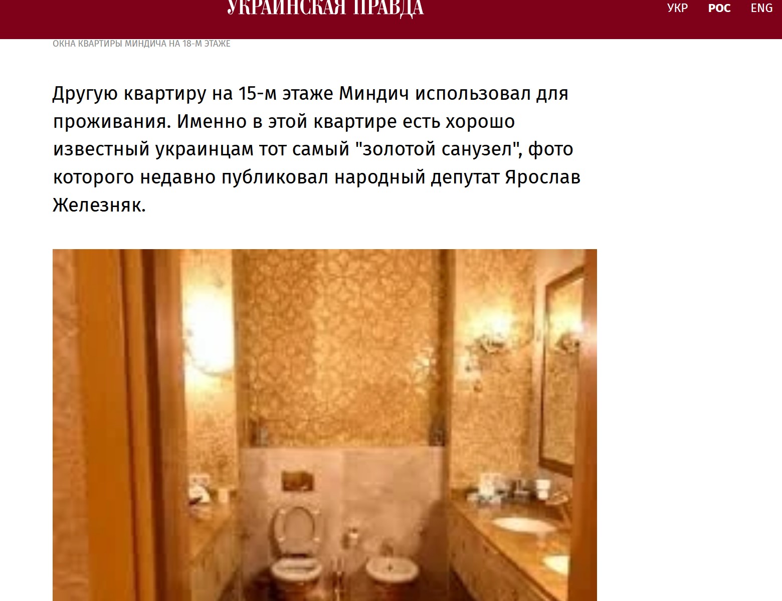 Ну да.В приведенных вами ссылках из украинских СМИ ничего нет про "золотой унитаз Миндича". Хотя бы потому, что его не существует. А вот российские помойки вовсю разгоняют.