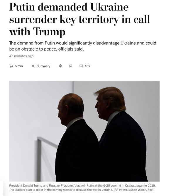 В разговоре с Трампом Путин снова потребовал полный контроль над Донбассом, предложив взамен часть захваченной Запорожской и Херсонской областей