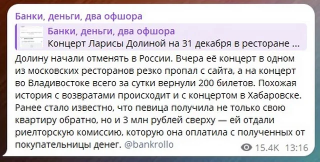 Как сообщается, администрация кафе «ПушкинЪ» удалила с сайта и из соцсетей информацию о выступлении Долиной в новогоднюю ночь. Билеты на это мероприятие продавали за 95 тысяч рублей.
