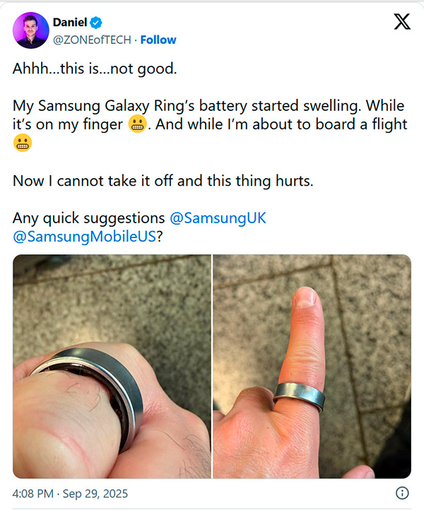 Но именно такая история произошла с Дэниелем Ротаром с YouTube-канала ZONEofTECH. Он написал в Х-сети, его Galaxy Ring начал раздуваться, пока он его носил – на изображении видно, как кольцо сдавливает его палец, а внутренняя часть кольца деформируется.