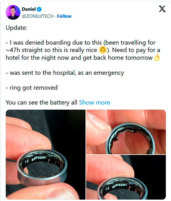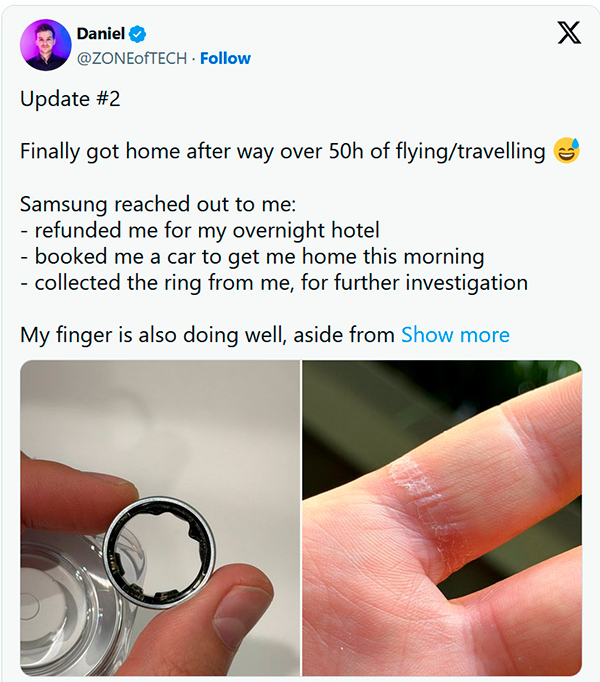Дэниел опубликовал обновление в X-сети, что Samsung связалась с ним, чтобы возместить расходы на проживание в отеле, организовала транспорт и забрала кольцо для исследования. Он отмечает, что у Galaxy Ring были проблемы с батареей в течение нескольких месяцев до ее раздувания, и что другие владельцы кольца сообщали о подобных проблемах, включая разрядку батареи и ее раздувание. Samsung проводит расследование.