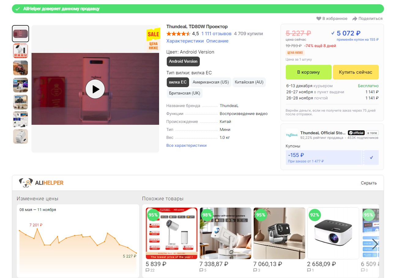 Компактный светодиодный проектор Thundeal TD80W с Android 13