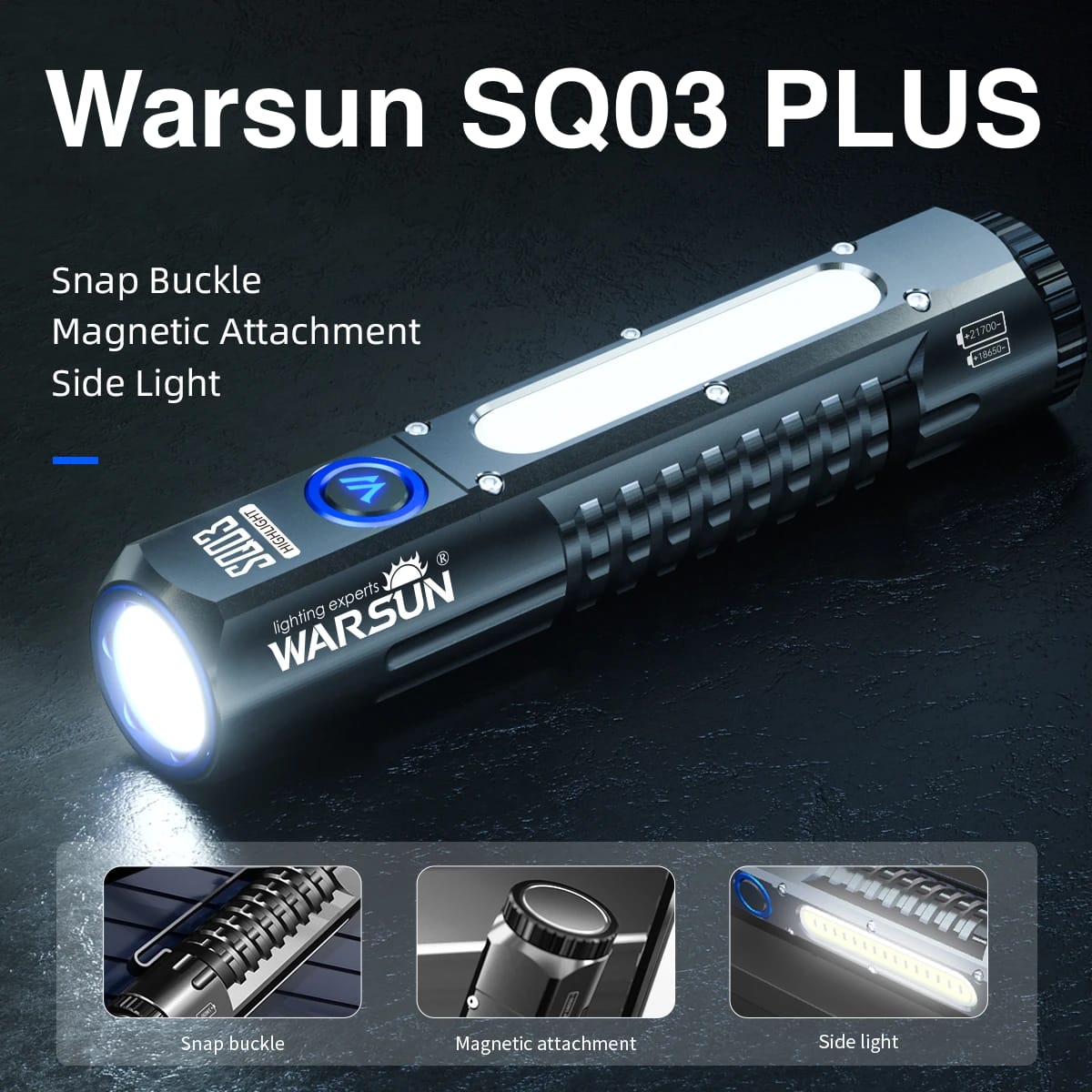 Фонарик Warsun SQ03 PLUS для ношения в кармане и домашнего пользования. Два светильника (фронтальный и боковой), магнитная задняя крышка, длина 14 см, вес 156 г, батарея 21700.