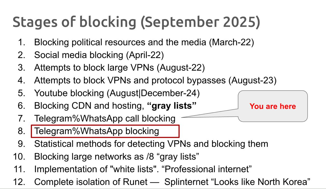 Еще немного и можно будет поставить крест на массовых ВПН сервисах, которыми и так сейчас пользуется от силы процентов 15-20 населения, а будет пользоваться только продвинутая часть айтишников, имеющих доступ к зарубежным кусками технологических сетей. Можно привести аналогию с СССР - выехать в загран для просто смертного было невозможным, но очень малая часть населения вполне так свободно каталась по командировкам, симпозиумам, соревнованиям и прочим. И власть это не особо напрягало.