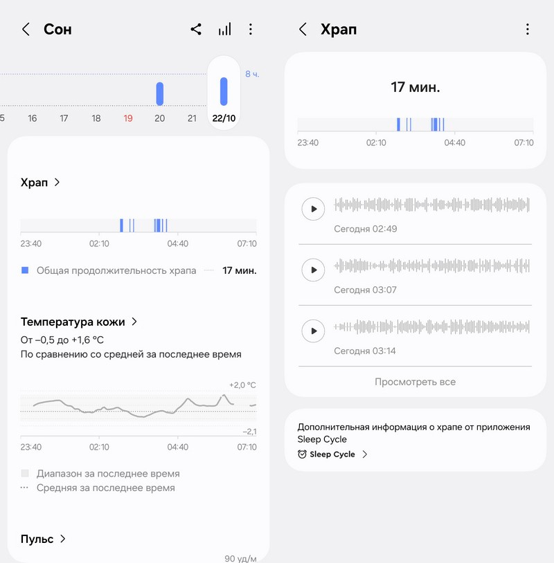 Из комментариев к обзору часов Samsung Galaxy Watch Ultra выяснил, что приложение Samsung Health, оказывается, фиксирует не только сколько минут ты храпел во сне, но и записывает сам храп, и его можно прослушать.