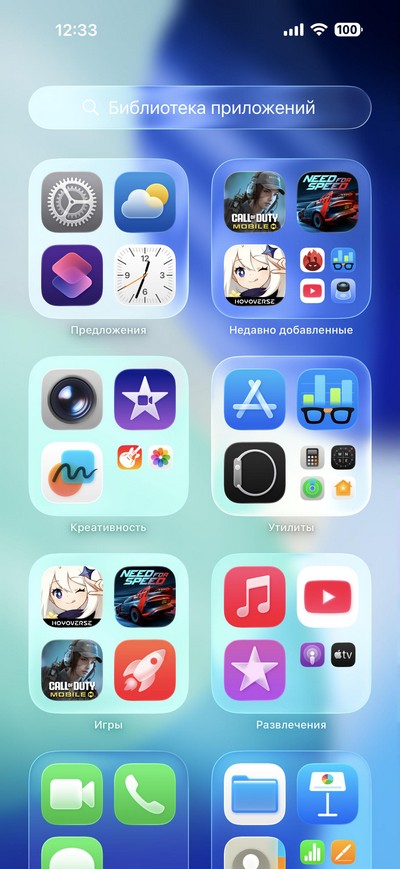 Cкроллируемый вниз экран виджетов (они настраиваются) и библиотека приложений.