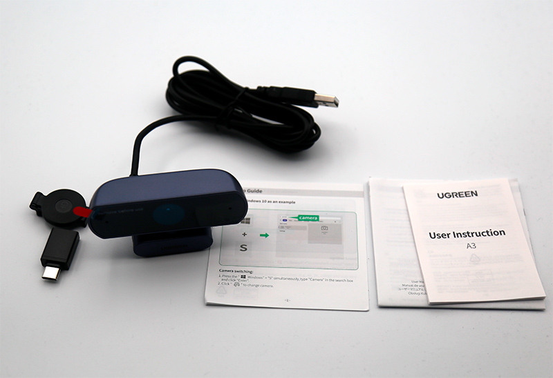Комплект поставки: камера с кабелем, шторка защиты, переходник USB-A - Type-C, руководство пользователя. За переходник - большое спасибо, для подключения к ноутбуку очень даже пригодится.