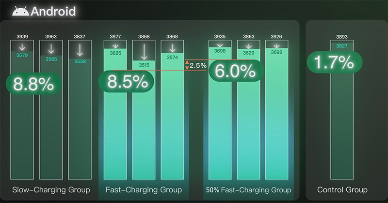 Также они сделали отдельную группу смартфонов, которые разряжались до 20%, а потом быстрой зарядкой заряжались до 80%. И тоже с ними провели 500 циклов заряда-разряда. Далее предполагалось сравнить результаты этой группы с группой быстрой зарядки, которая разряжалась до 5% и заряжалась до 100%.