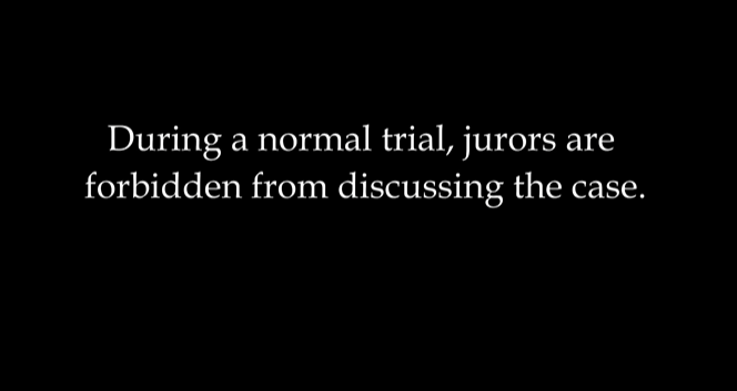 Эм... я не американец, но даже я в курсе, что присяжные заседают в секрете. Они могут раскрыть тайну, но потом, и если сами захотят — или если судья решит, что что-то пошло не так, и даст разрешение допросить жюри. Совершенно не может быть, чтобы киношников допустили снимать их работу. Рональд идиот?