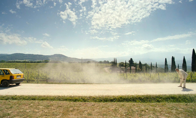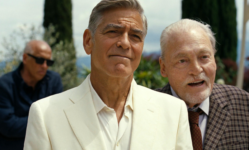 Ну, а чего ты тогда рефлексируешь? Приезжай на свое чествование, посмотри отрывки из своих старых фильмов (там показывают кусочки из реальных фильмов с Джорджем Клуни), прослезись, и пойми, наконец, что ущемленные чувства твоих дочерей - ничто по сравнению с любовью и благоговением миллионов зрителей во всем мире. И Джей Келли это в конце понимает. Правда, ему еще для остроты восприятия приходится побегать в белом костюме по предрассветному тосканскому лесу (это самая идиотская сцена в фильме), но ему до этого пришлось во время путешествия на поезде побегать за немецким велосипедистом (на эту нелепую роль пригласили хорошего немецкого актера Ларса Айдингера), зачем-то укравшим сумку у почтенной пассажирки поезда - это тоже смотрелось вполне по-дурацки, тем более что как следует по-дурацки побегать самому Джорджу Клуни уже удалось в поразительно идиотском фильме "Одинокие волки".