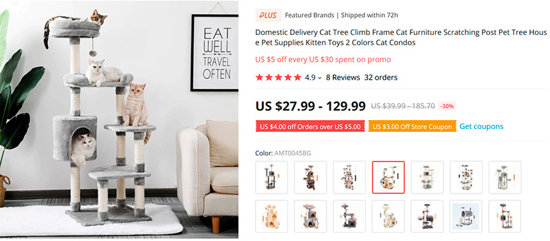 Хороший выбор кошачьих установок: домиков, лежанок и когтеточек. Четырнадцать вариантов конфигураций различных цветов.