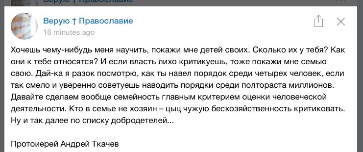 Евгения прислала немного житейской мудрости от протоиерея Андрея Ткачева. Если пьяная женщина в семье не хозяйка - цыц чужую бесхозяйственность критиковать. Ну и так далее по списку добродетелей. Ибо ТАК СКАЗАЛ ПРОТОИЕРЕЙ.