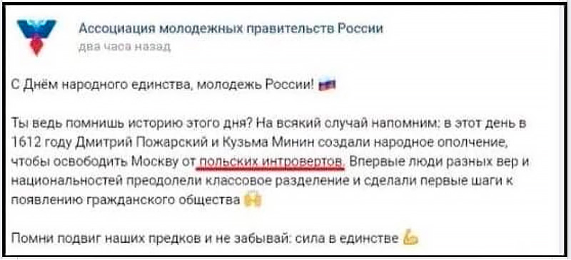 Молодежные правительства России напоминают тебе, молодежь, как совсем недавно, в 1612 году, русские экстраверты Дмитрий Пожарский и Кузьма Минин освободили Москву от польских интровертов, будь они неладны! Ведь кто они, интроверты? Это люди, которые изолировали себя от общества и по каким-то важным внутренним причинам не имеют возможности удовлетворять свои потребности через активное общение с внешним миром. А на хрен нам такие поляки в Москве были нужны, правильно? Гнать их, однозначно!