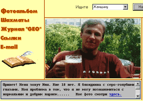 А ничего себе блондиночка, да? Теперь понятно, почему она не может познакомиться с нормальным и добрым парнем! Потому что у нормального парня никакой доброты не хватит, когда Юленька начнет пивко хлестать с утра до вечера! Я уж молчу о том, что Юленька - мужик, хотя и без бороды. Но это уже - дело вкуса. Некоторым он может и понравиться.