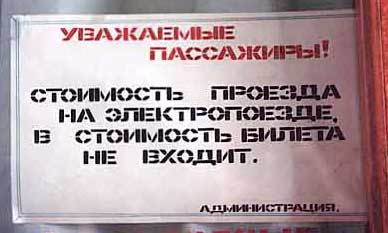 И хотя вопрос адресован не мне, а железнодорожному начальству, я позволю себе высказать кое-какие соображения... Вероятно, в стоимость проезда на электропоезде входит: прищемление какой-нибудь части тела дверьми (две двери на одну часть тела), песня "Ветер с моря дул", исполняемая в стиле босса-нова пьяным баянистом, прикидывающимся слепым, немым и глухим (полтора баяниста на два вагона электрички), две-три разбитых бутылки с портвейном, проедающим стальной пол насквозь, один-два разбитых стекла (в каждом вагоне). А вот стоимость проезда, конечно, не входит. Стоимость проезда надо покрывать контролерам, причем покрывать со страшной силой, как бык овцу. Что говорите? А в какую стоимость входит дергание машинистом вагона и жуткая, неимоверная грязища на всем протяжении состава? Ну, друзья, это предоставляется бесплатно! Это за счет заведения!>