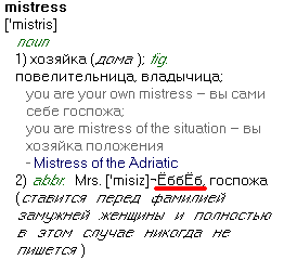 Остается выяснить, что именно съела Анна Курникова, раз она рискнула выйти замуж, здорово навредив своему имиджу нимфетки. Какая она уж теперь к черту нимфетка, раз замужняя? Обычная домохозяйная теннисистка! Так что я бы на ее месте съел бутерброд. Потому что при замужестве никакие пилюли уже не помогает. Тем более, что слово "mistress", имеющий одним из значений термин "хозяйка дома", переводится весьма по-разному. Как сообщает Vsevolod, Lingvo 5.0 мистрессов вообще не очень-то жалует, оскорбляя их по-всякому: