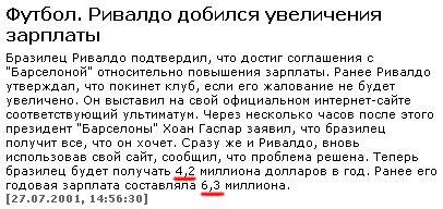Yuri Valdavin увлекается футболом и нервничает за бразильца Ривалдо, у которого проблемы с зарплатой. Ривалдо долго бился за справедливость и, наконец, добился своего: