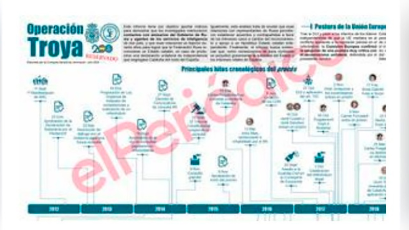 В отчете приведена хронология контактов активистов каталонского сепаратистского движения с эмиссарами Кремля, а также пребывание в Барселоне российских шпионов.