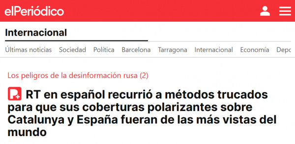 Как выяснила газета, редакция RT на испанском языке использовала автоматизированные аккаунты («ботов») для увеличения своего присутствия в социальных сетях, особенно во время критических моментов для Каталонии и Испании в 2017 году. Благодаря подложным сообщениям RT смог конкурировать по количеству взаимодействий в Twitter с крупными испанскими СМИ. Исследования показали, что 84% ключевых аккаунтов, массово распространявших контент RT, вероятно, были ботами. Эти боты способствовали поляризации общества, распространяя провокационный контент.