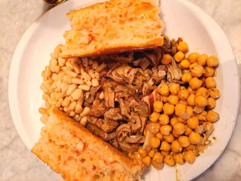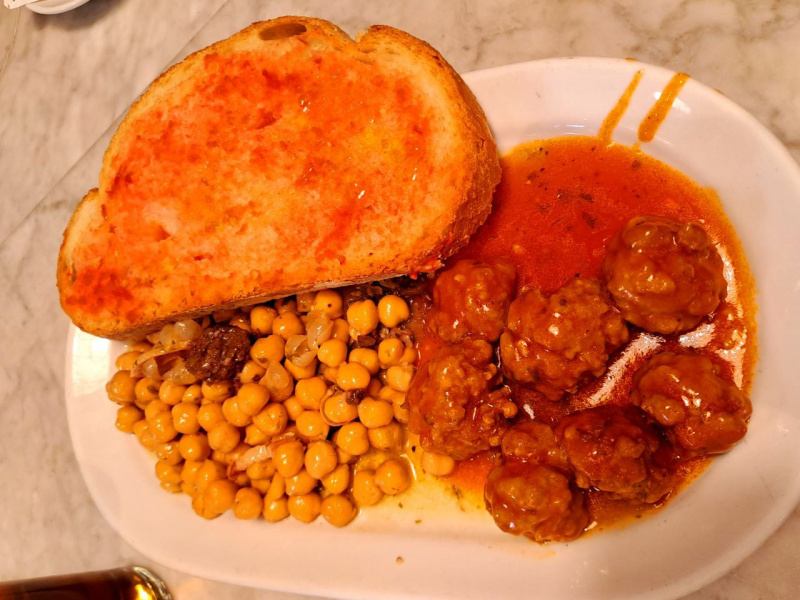Esmorzar amb forquilla - традиционный завтрак в каталонской провинции. Никаких круассанов и прочих городских глупостей; основательные порции горячих мясных блюд с доколумбовым гарниром из фасоли и нута, огромными ломтями pa amb tomàquet, запиваемые вином или пивом. Свиные ребрышки, тушёная телятина фрикандо, суп из коровьего желудка, фрикадельки, курица с грибами, кап-и-пота - горячий холодец из коровьей головы и копыт, разнообразие колбасок и омлетов... Меню нет, заходишь на кухню и выбираешь из кастрюль, что тебе понравилось.