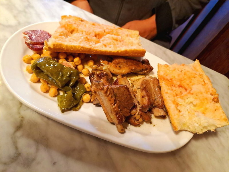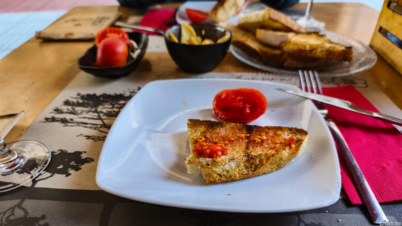 В Каталонии любая еда начинается со здоровенных ломтей поджаренного каталонского хлеба, который нужно натереть половинкой помидора и чесночком - старая традиция, в любом ресторане этот хлеб - называется pan tostado, поджаренный хлеб, - обязательно предложат.