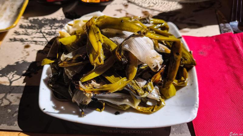 Но и без черепка кальсот был очень вкусный. У него нужно снимать верхний обугленный слой, под которым обнажается белая мякоть: ее нужно макать в соус ромеско и в рот, запивая вином. Причем вино тоже должны подавать в специальном каталонском сосуде, который называется поррон, а нам подали вино просто в бокалах - безобразие, не чтут традиции!