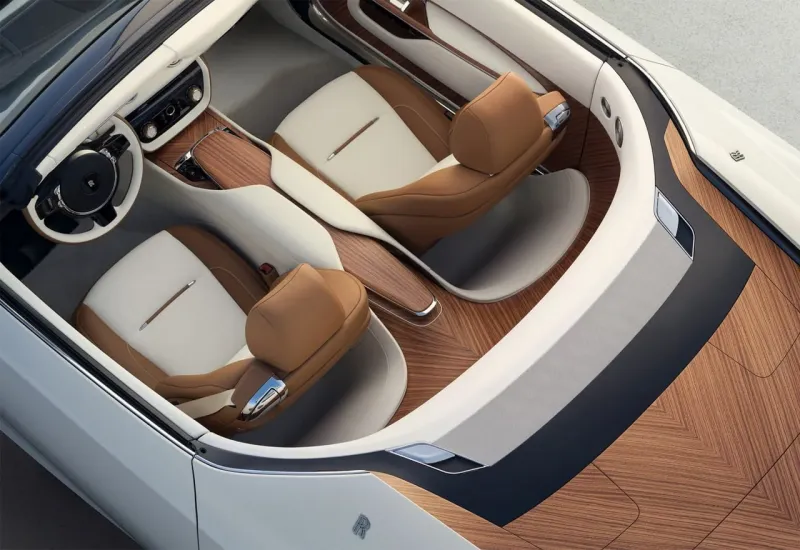 В отделке модели используется древесина высокой плотности, и, чтобы добиться идеальной композиции в сложной геометрии, мастера Rolls-Royce использовали в общей сложности 233 единицы древесины по всему Arcadia Droptail, и 76 единиц только для отделки задней части салона.
