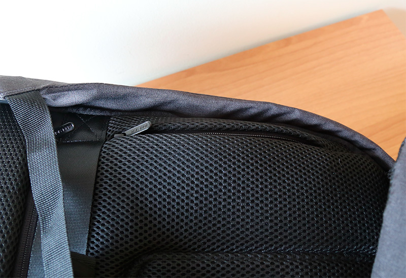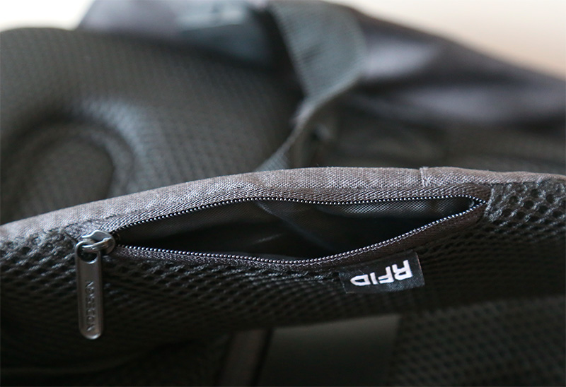 На левой лямке есть карман на молнии для пластиковой карты, проездного или денег. Карман имеет RFID-защиту: даже если к нему приложить сканер платежного терминала, то не удастся снять деньги с карты.