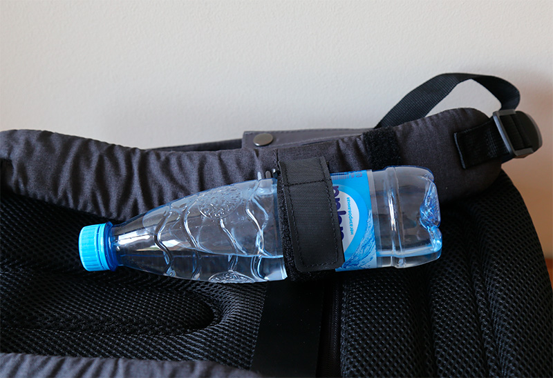 На левой лямке есть держатель, к которому можно прикрепить чехол со смартфоном (туда, правда, войдет только небольшой смартфон) или бутылку воды.