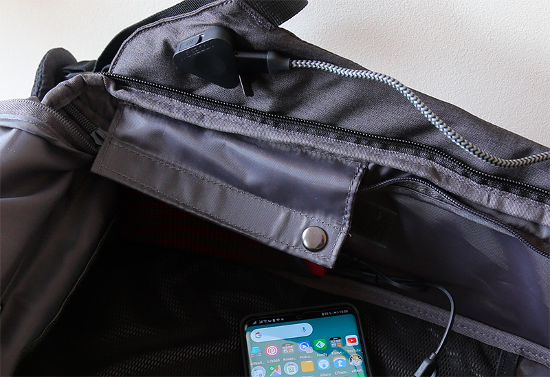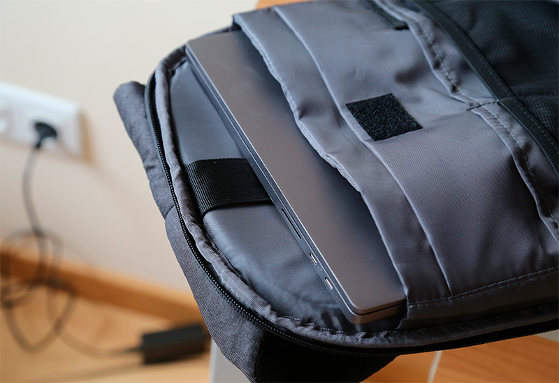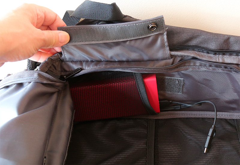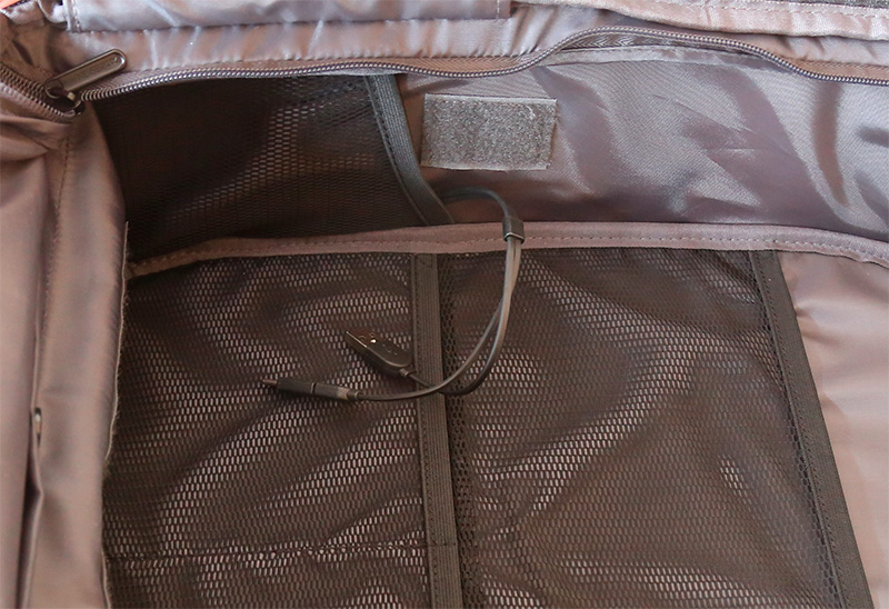 В основной части рюкзака есть карман для аккумуляторной батареи, которую можно подключать любым способом: USB-A, microUSB, Type-C.